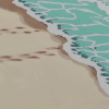 Description: gif from a retro looking anime of waves placidly crashing on a sandy beach, two sets of prints leading into the water